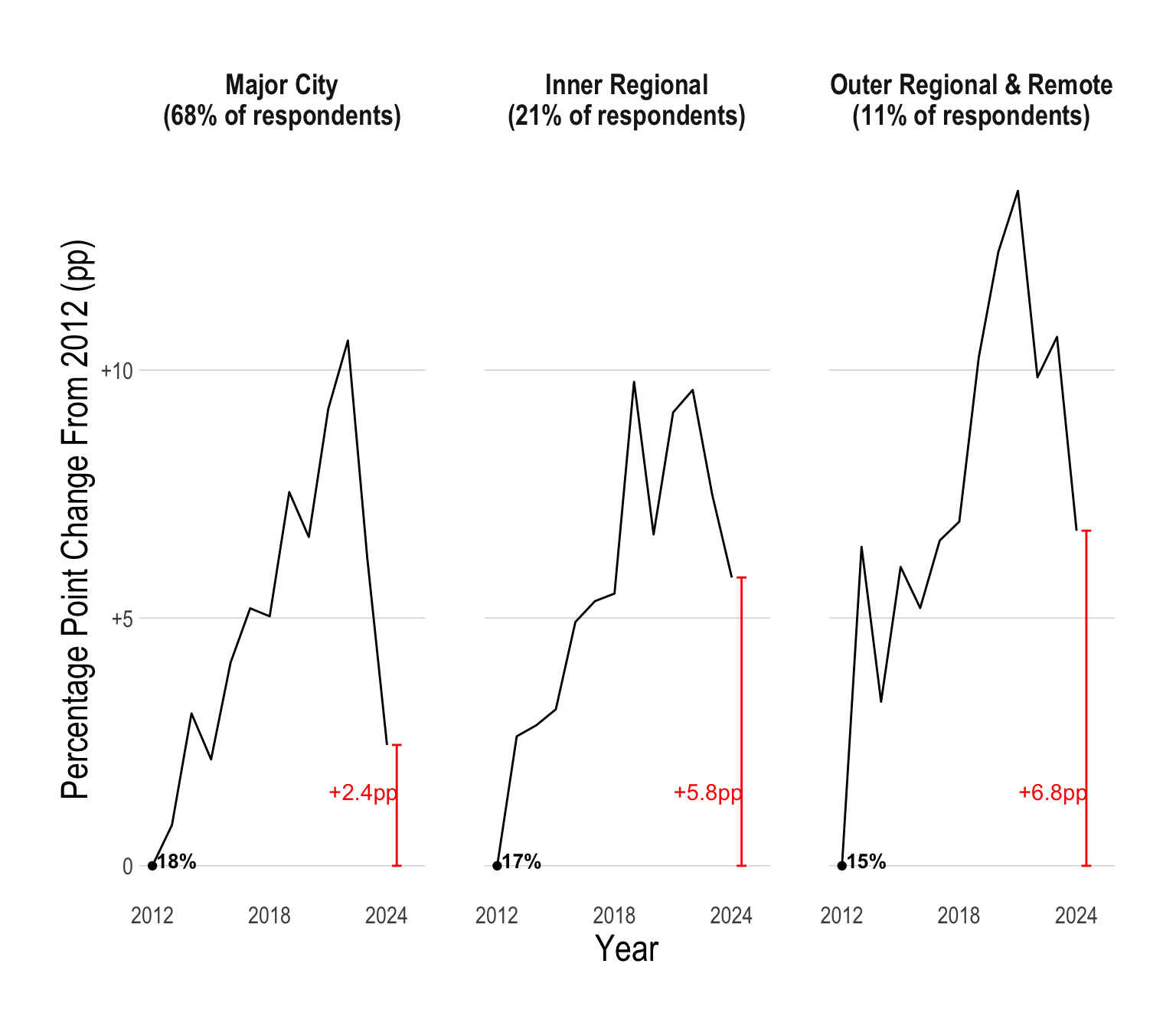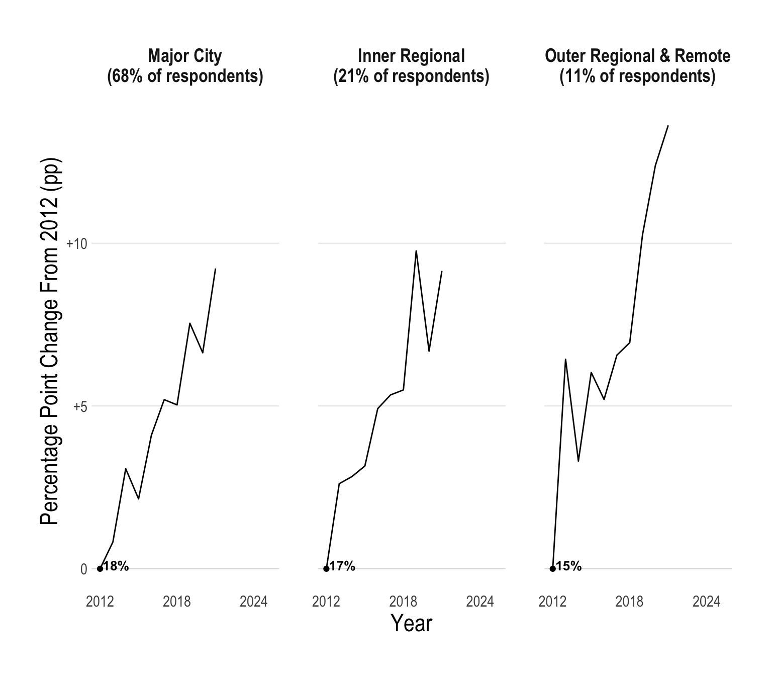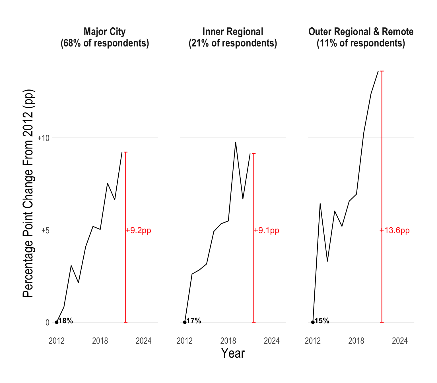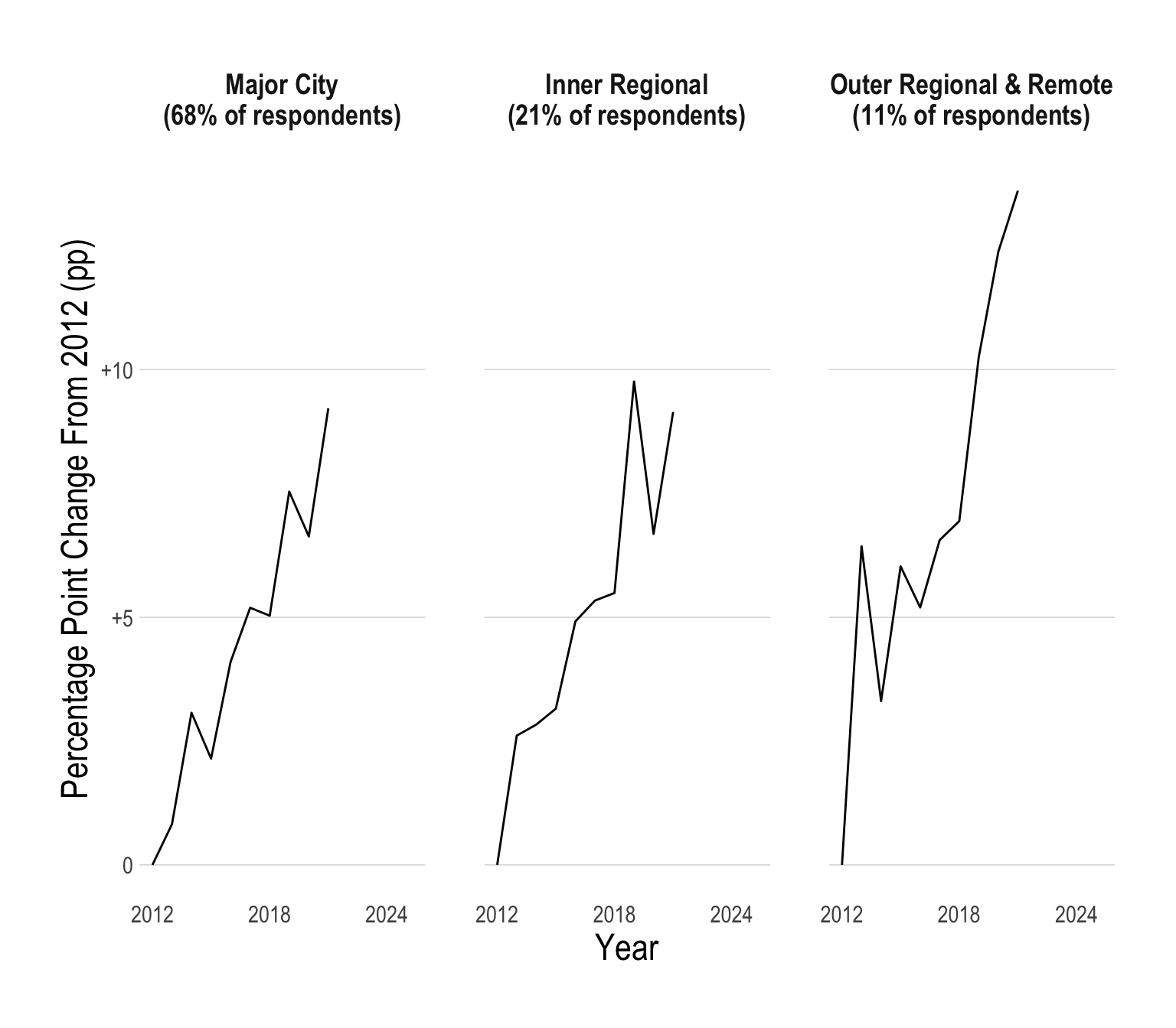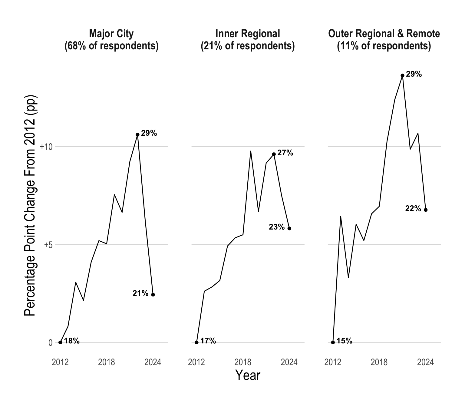 Historically, a smaller proportion of young people in regional Australia have had psychological distress when compared to young people in major cities. However, recently, there has been a massive spike in young people in outer regional and remote parts of Australia suffering from psychological distress.